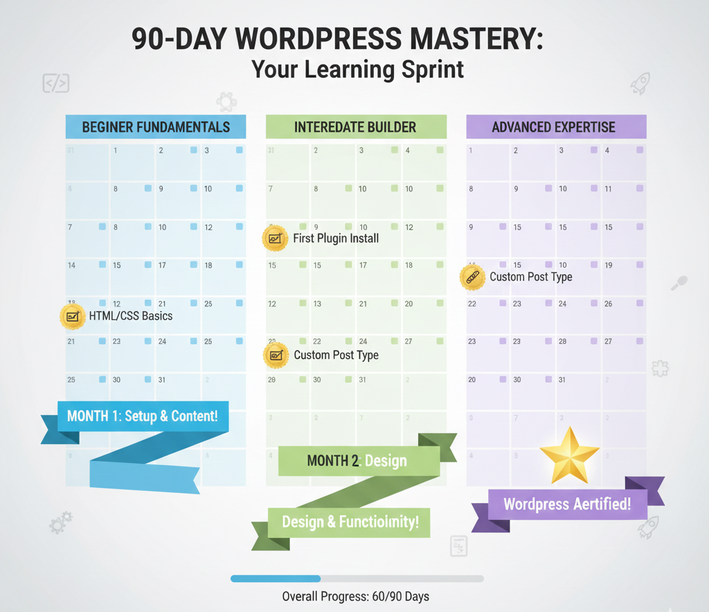 Week 1: Set up practice environment, explore dashboard Week 2: Master posts, pages, and media Week 3: Learn themes and customization Week 4: Understand plugins and basic functionality