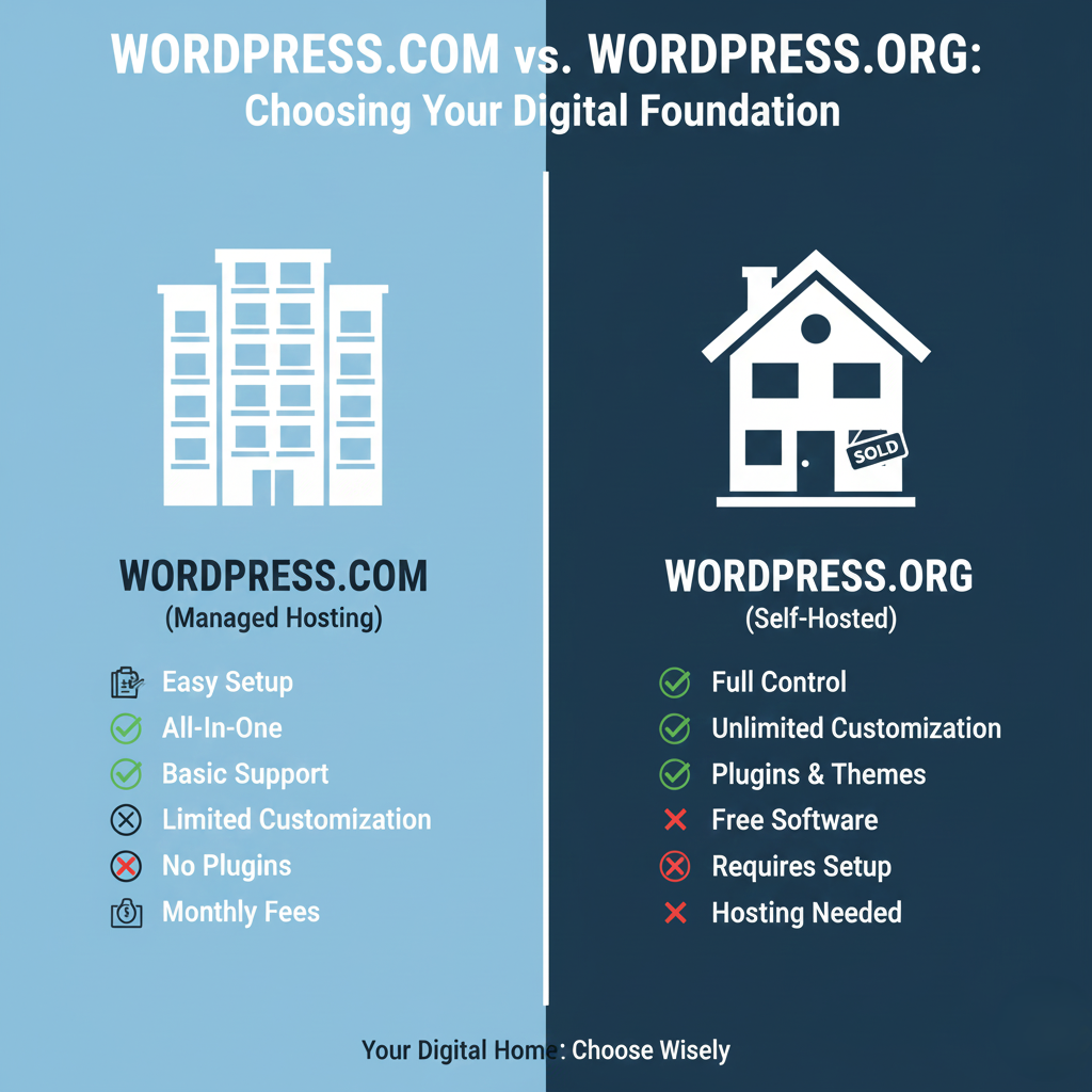 WordPress.com: This is the hosted solution. Think of it as renting an apartment. WordPress.com manages everything for you, but you have limited control and must pay for premium features.